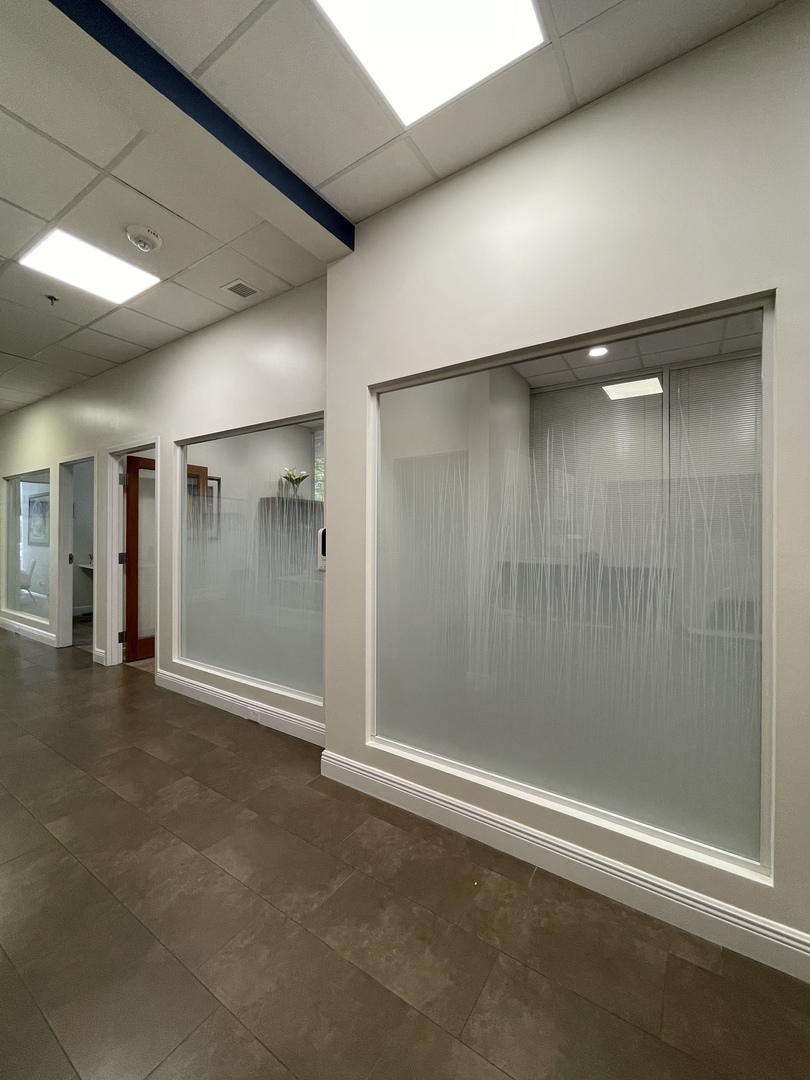 Using a decorative privacy window film featuring small, repeating shapes creates a beautiful and intentional office design that adds harmony to the workspace. This simple yet effective privacy barrier ensures that while much of the glass remains exposed, there is just enough visual distraction to prevent the office from feeling like a fishbowl. The repeating patterns bring a sense of order and elegance to the space, enhancing its aesthetic appeal while maintaining functionality. By striking the perfect balance between openness and privacy, this window film contributes to a more comfortable and productive work environment. Pictured: SXC-4410 Frosted Squares